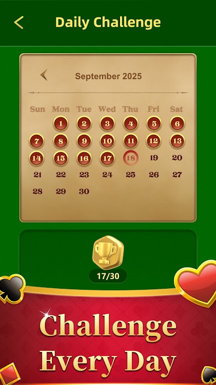 हमारा रॉयल सॉलिटेयर आपके दैनिक सिंगल-प्लेयर गेमप्ले में एक दैनिक चुनौती सुविधा पेश करता है। यह सुविधा आपकी दैनिक चुनौतियों को रिकॉर्ड करती है, जिससे आपको लगातार अपनी सोच और मानसिक कौशल का अभ्यास करते हुए उपलब्धि की भावना मिलती है।