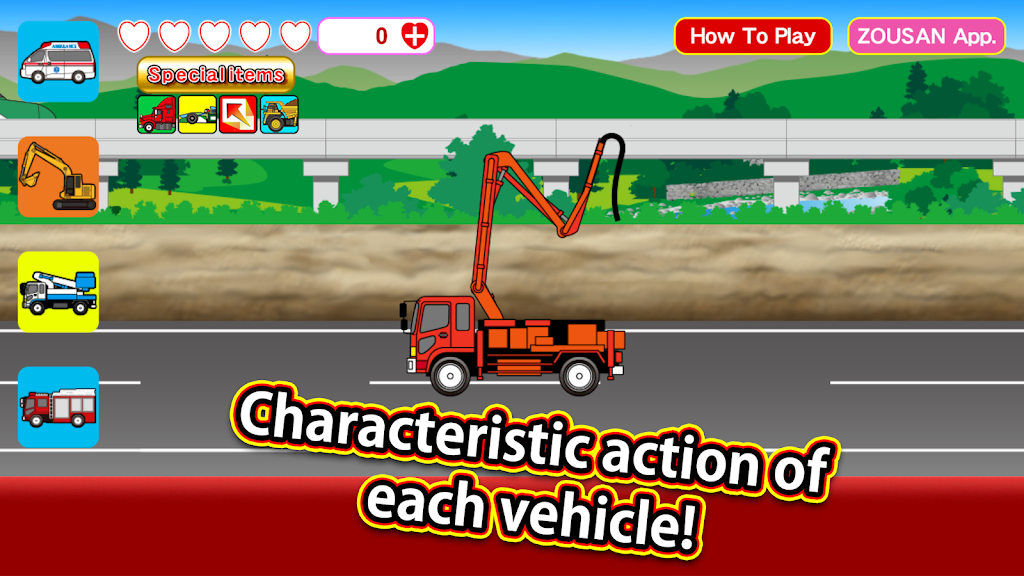 Bir simgeye dokunmak, ekranın ortasında çalışan aracın türünü değiştirir. Bir araca dokunmak, benzersiz hareketlerini görmenizi sağlar. Farklı eylemleri tetiklemek için diğer geçen araçlara da dokunabilirsiniz. Bazen dinozorlar veya UFO'lar görünebilir; ne olduğunu görmek için onlara dokunmayı deneyin. Mermi trenleri de dahil olmak üzere trenler de arka planda görünür.